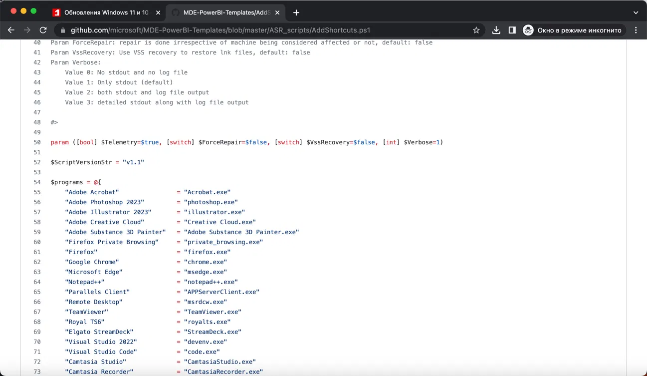 Скрипт доступен на GitHub и включает довольно короткий список приложений и их исполняемых файлов. В списке преобладают приложения Microsoft, но администраторы также находят в списке сторонние приложения, такие как Notepad++, 7-Zip, Firefox или Camtasia Studio.