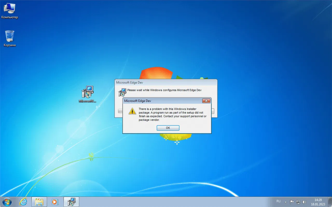 Автономный установщик для Edge Dev отобразил сообщение о том, что обнаружена проблема с пакетом установщика Windows.