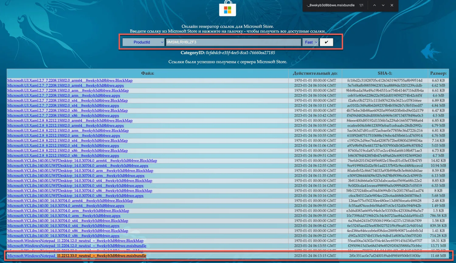 - Подождите, пока будут сгенерированы ссылки. Прокрутите вниз до конца страницы. Нас интересует установщик с именем Microsoft.WindowsNotepad_11.2212.33.0_neutral_~_8wekyb3d8bbwe.msixbundle и размером около 11,68 МБ. Вы также можете скачать этот файл в zip-архиве напрямую с нашего сайта: здесь.