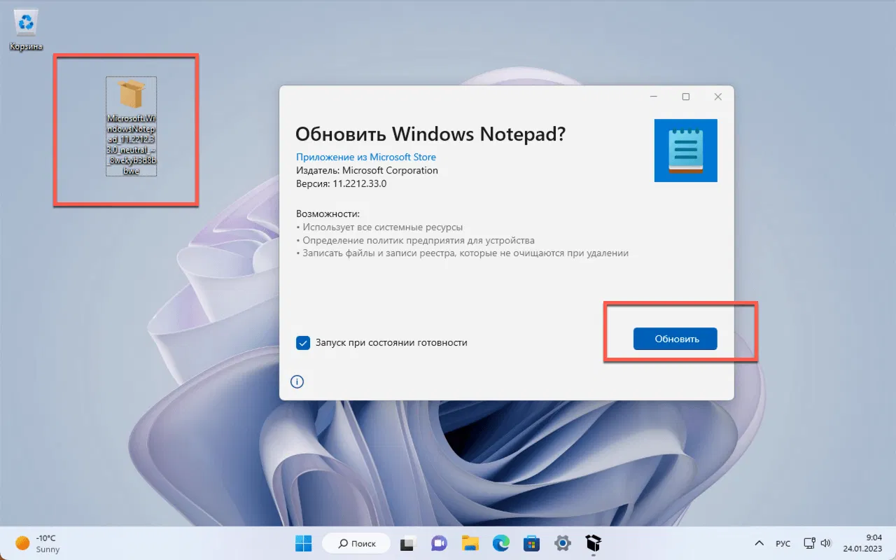- При запуске файла, Windows спросит, хотите ли вы обновить текущую версию Блокнота. Нажмите кнопку Обновить, чтобы продолжить установку. Для установки необходима программа Установщик приложения из Microsoft Store.