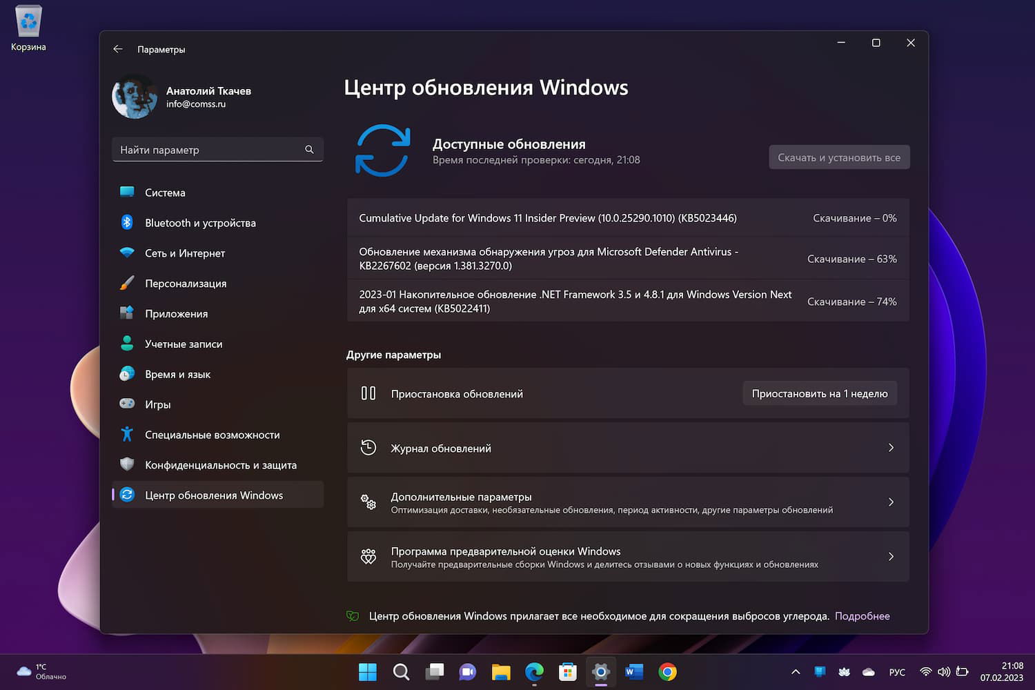 Перейдите в меню Параметры > Центр обновления Windows и нажмите Проверить наличие обновлений. Для завершения установки потребуется перезагрузка компьютера.