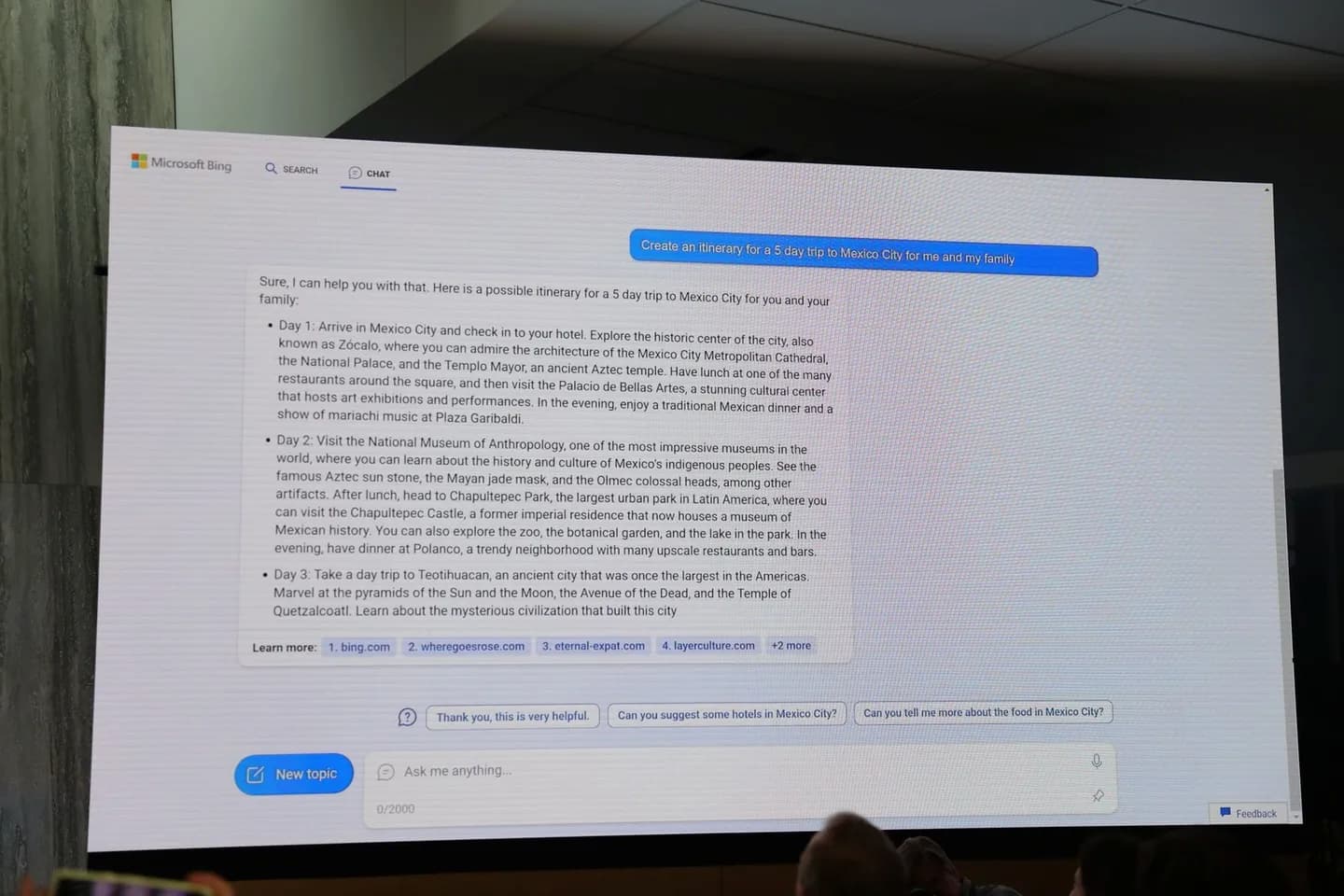 Компания показала ряд примеров поиска: рецепты, советы по путешествиям, покупки мебели в Ikea и многое другое. В одной из демонстраций Bing попросили "составить маршрут на каждый день 5-дневной поездки в Мексику". На этот вопрос ответил чат-бот, описав маршрут вместе со ссылками на источники информации.