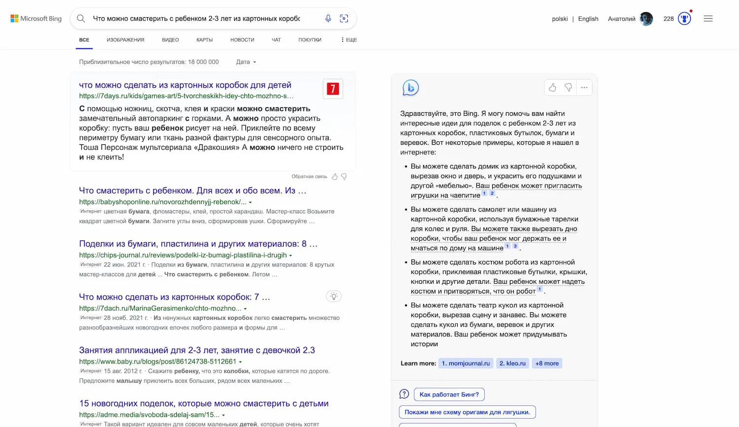 Если вы посетите сайт Bing.com, вы можете увидеть несколько примеров поиска, которые вы можете опробовать, если вам покажут новый интерфейс. Нажав на них, вы попадете на страницу поиска Bing с традиционными результатами слева и окном чата с ответом, сгенерированным ИИ, справа.