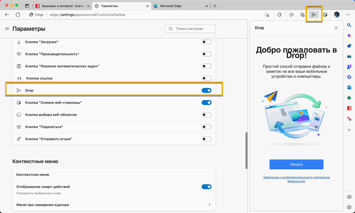 Как включить функцию Drop в Microsoft Edge