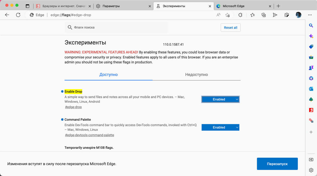 - Активируйте функцию в экспериментальных настройках с помощью флага edge://flags/#edge-drop и перезагрузите браузер.