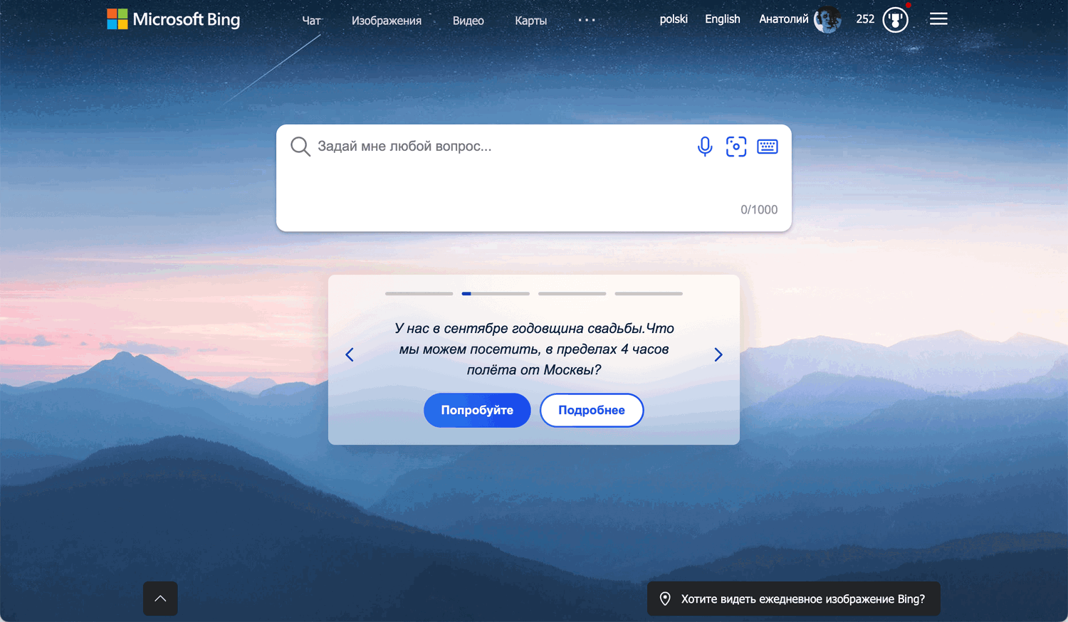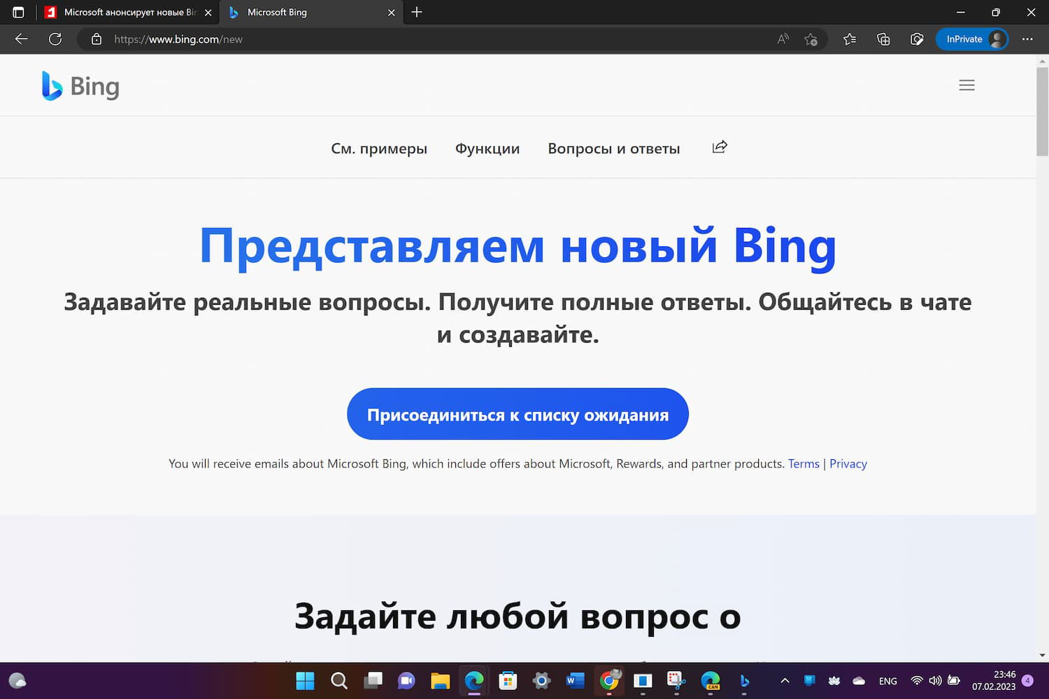 "Мы рады предоставить вам доступ к ранней предварительной версии новой поисковой системы Bing – вашему второму пилоту в Интернете, управляемому искусственным интеллектом. Когда вы начнете использовать продукт, мы будем благодарны за ваши отзывы, чтобы сделать новый Bing еще лучше. Пожалуйста, используйте кнопки обратной связи, чтобы помочь нам учиться. На данный момент, компания еще не готова представить мобильный интерфейс, но активно работает над его разработкой. Пользователи могут продолжать использовать новую версию Bing на настольных компьютерах и загрузить приложение Bing из магазина приложений, чтобы сразу попробовать новые функции, когда мобильный интерфейс будет готов."