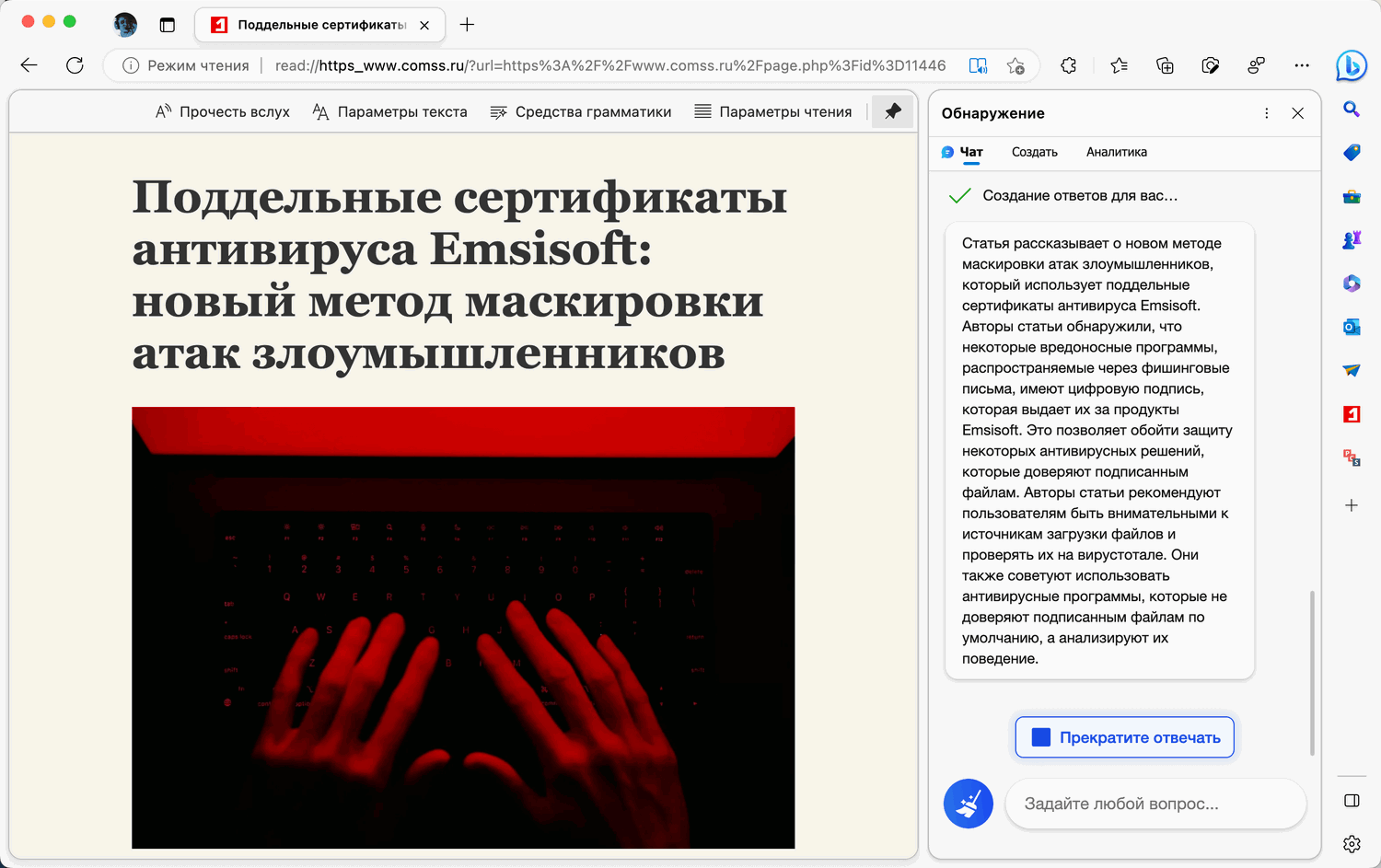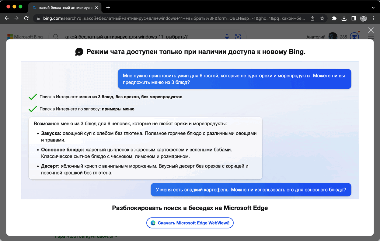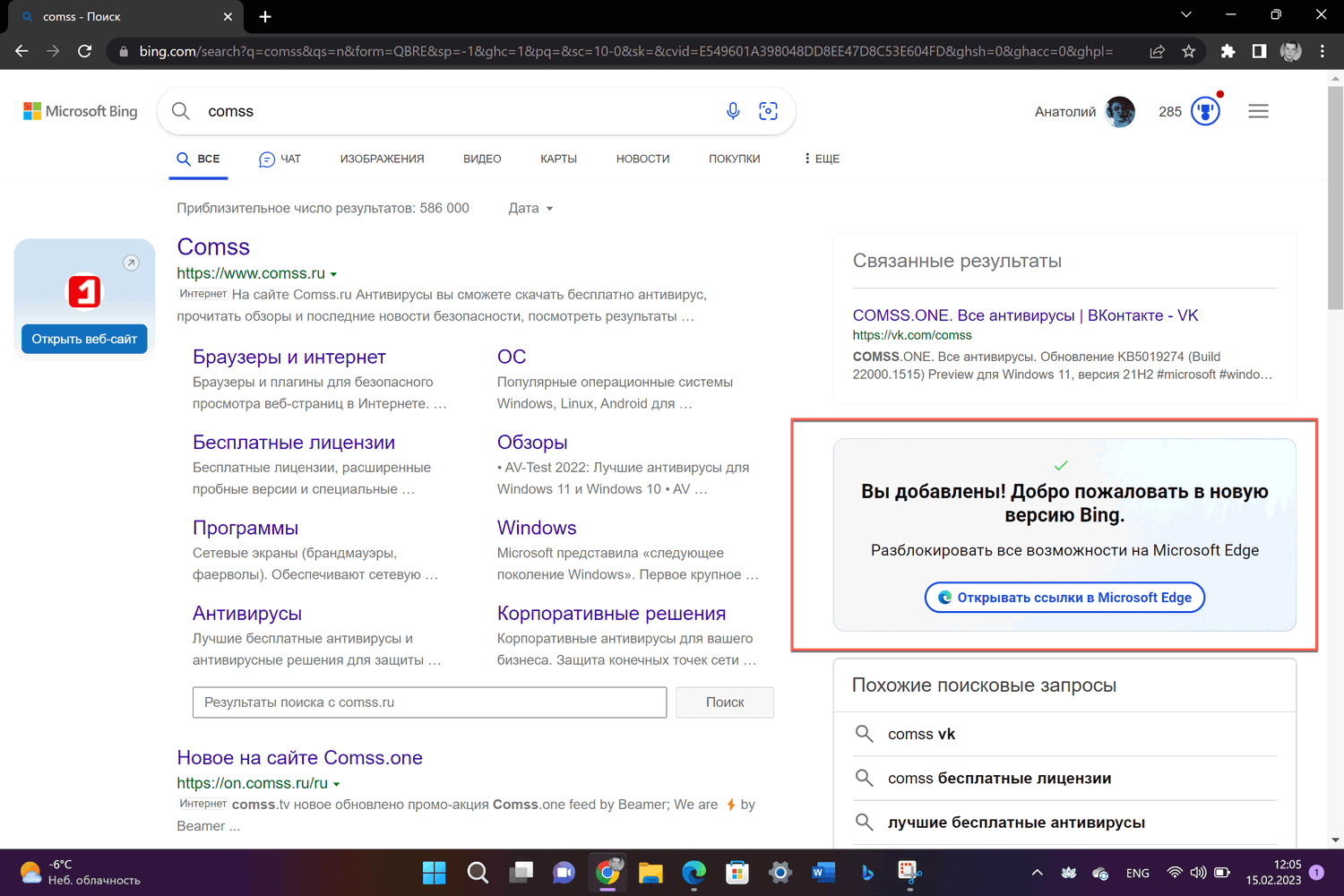 Портал Comss.ru также получил доступ к новым функциям Microsoft Bing. Однако, при тестировании выяснилось, что использование функции "Чат" в новом поиске Bing ограничено только браузером Microsoft Edge. Пользователи, пытающиеся использовать функцию чата в других браузерах, будут перенаправлены на Edge.