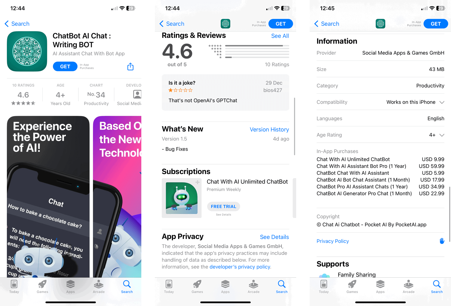За последний месяц появилось несколько предупреждений о проблеме поддельных приложений ChatGPT. Как же эти фальшивые приложения проходят проверку в Google Play Store и App Store? До сих пор 2 таких приложения, упомянутых в статьях TechCrunch и Macrumors месячной давности, все еще доступны в App Store.