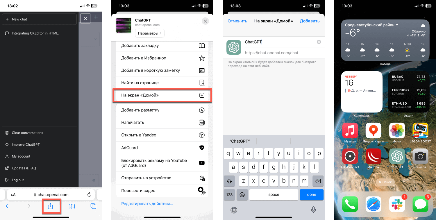 В результате на домашнем экране смартфона появится ярлык на сайт ChatGPT, вы можете нажать на него, чтобы открыть сайт в браузере.