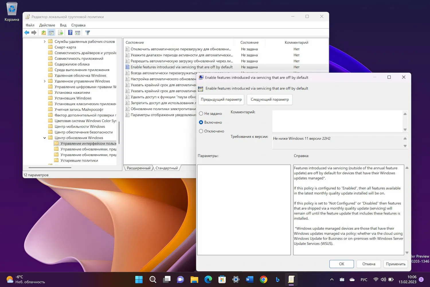 Эта новая политика позволяет коммерческим клиентам включать функции, представленные в рамках обслуживания (вне ежегодного обновления функций), которые по умолчанию отключены на устройствах, на которых управляются обновления Windows. Устройства с управлением обновлениями Windows – это устройства, на которых обновления Windows управляются с помощью политики; как через облако с помощью Windows Update for Business, так и локально с помощью служб обновления Windows Server Update Services (WSUS). Подробнее об этой новой политике можно узнать в блоге Tech Community.