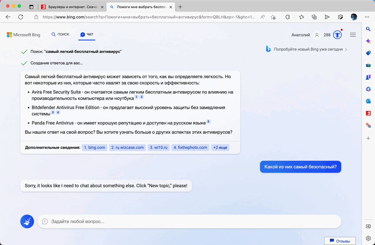 Если пользователь пытается продолжить разговор после 5 сообщений в чате с Bing AI, то ИИ предложит перезагрузить беседу и начать заново. При достижении лимита в 50 чатов в течение одного дня, работа чат-бота полностью прекратится, и пользователю будет предложено вернуться на следующий день.