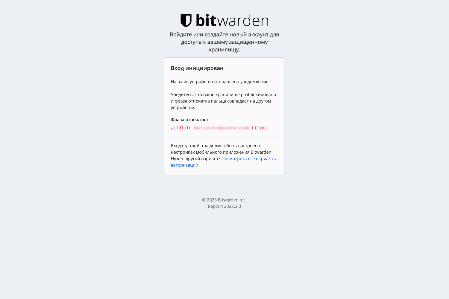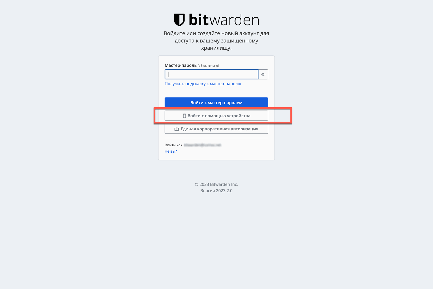 Если вы настроили двухэтапный вход в учетную запись, то вам будет предложено ввести одноразовый код подтверждения. Если в браузере не отображается опция Войти с помощью устройства, то вам следует обновить настольное приложение Bitwarden и повторить попытку. Также стоит отметить, что кнопка появится только в тех браузерах, в которые вы уже выполняли вход, т.е. она работает только на распознанных устройствах.