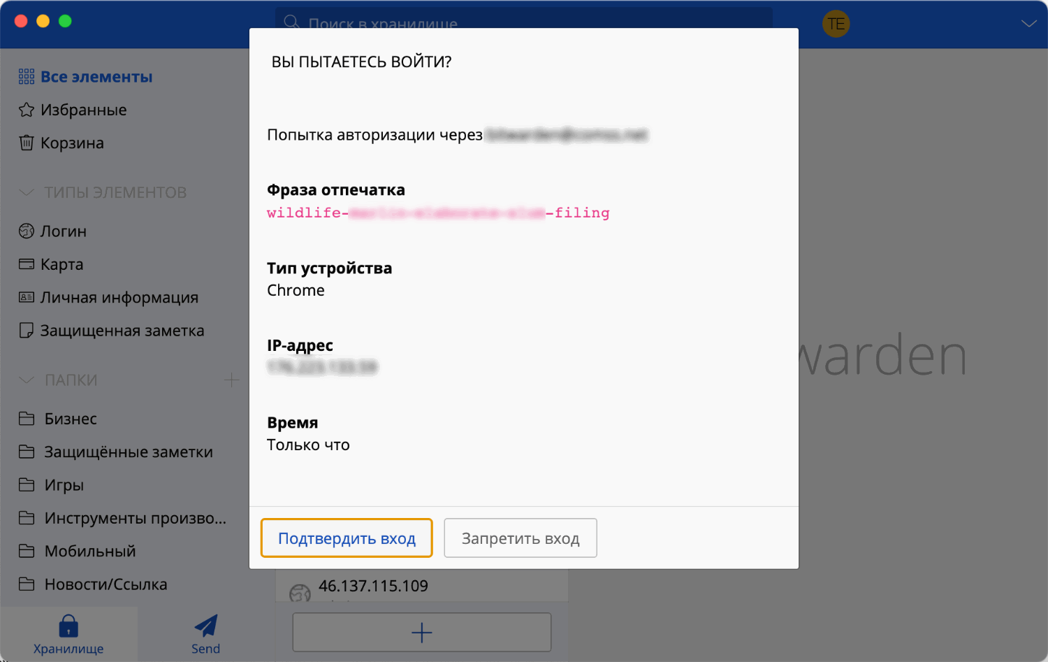 - Переключитесь на настольное приложение Bitwarden, и вы должны увидеть всплывающее окно с подробной информацией о попытке входа в систему. В push-уведомлении указан IP-адрес, с которого был сделан запрос, время и браузер, использованный для входа. На этой панели также отображается фраза отпечатка. Вы можете использовать эту информацию, чтобы проверить, является ли попытка входа легитимной