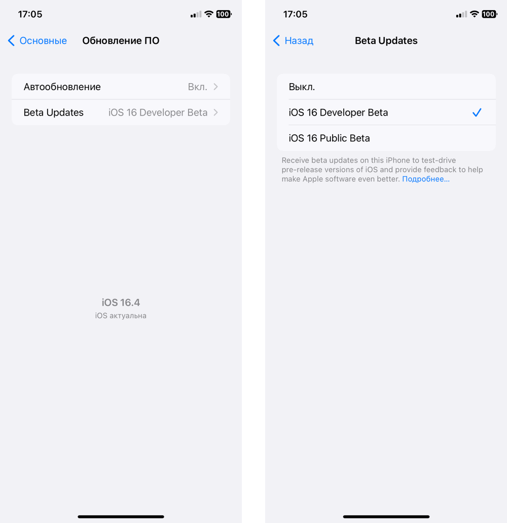 Начиная с бета-версии iOS 16.4, на iPhone появилось новое меню Beta Updates (Бета-обновления) в приложении Настройки в разделе Основные > Обновление ПО. Это меню позволит участникам программы Apple для разработчиков включать бета-версии iOS непосредственно на iPhone, без необходимости устанавливать профиль конфигурации с сайта Apple Developer.