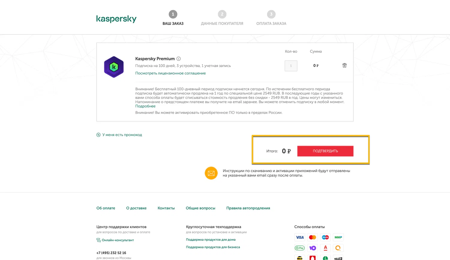 Примечание. Вы можете активировать Kaspersky Premium только в пределах России.