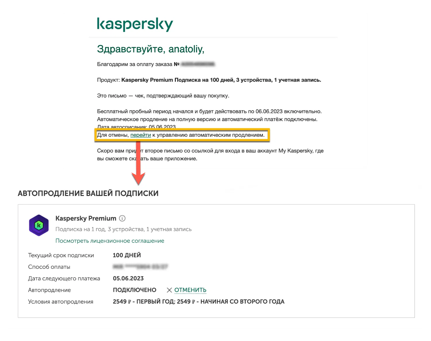 Для отмены автоматического платежа, перейдите к управлению автоматическим продлением по ссылке в полученном письме с лицензией и отключите автопродление.
