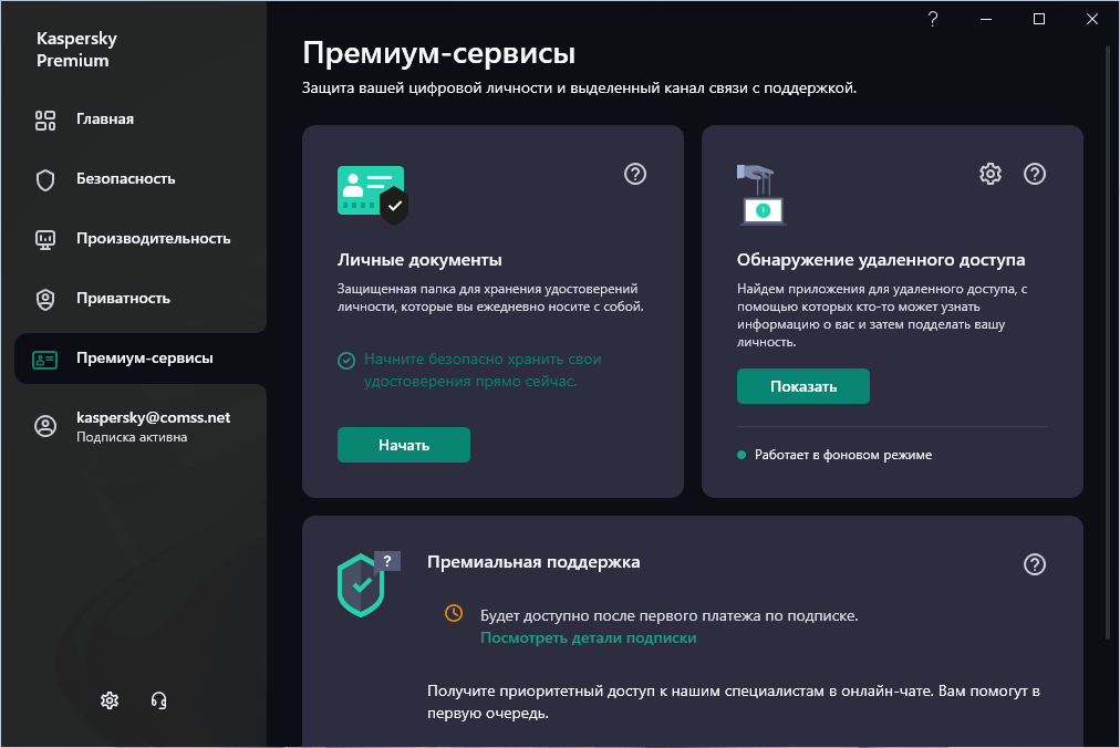 В дополнение к функционалу защиты, Kaspersky Premium предоставляет премиальную поддержку, которая помогает проверить производительность ПК, оценить уровень защиты, почистить от вирусов и настроить все нужные параметры.