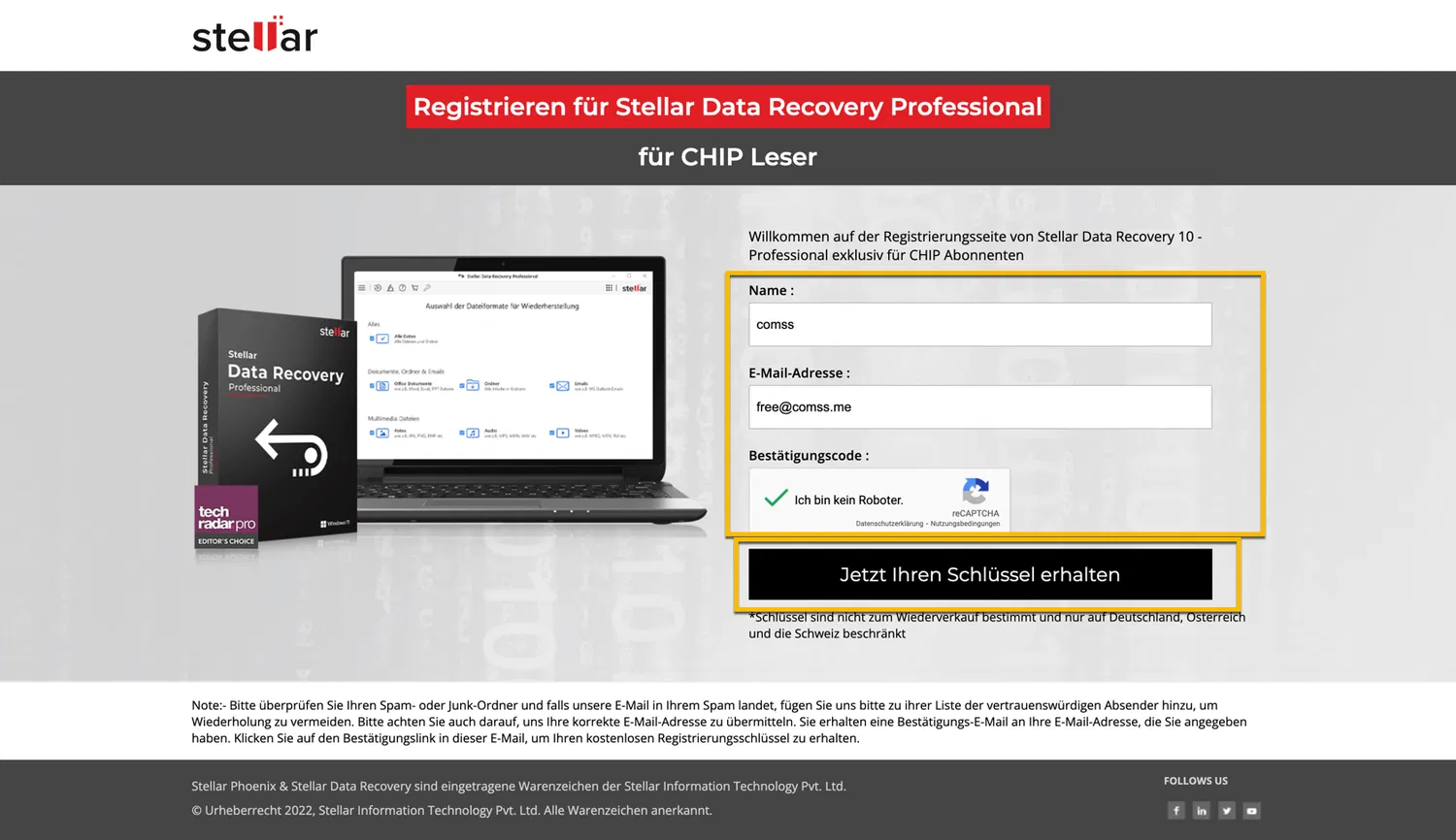 - Заполните форму вашими данными, указав действующий адрес электронной почты, и нажмите кнопку Jetzt Ihren Schlussel erhalten.