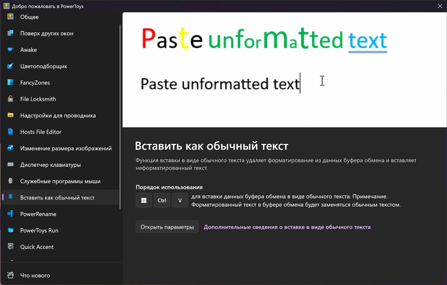Инструмент PowerToys добавляет общесистемную вставку в виде простого текста. Добавлено поддержка нового сочетания клавиш Windows+Ctrl+V для вставки данных из буфера обмена в виде обычного текста. Любое форматирование удаляется из буфера при вызове этой горячей клавиши на устройстве Windows.
