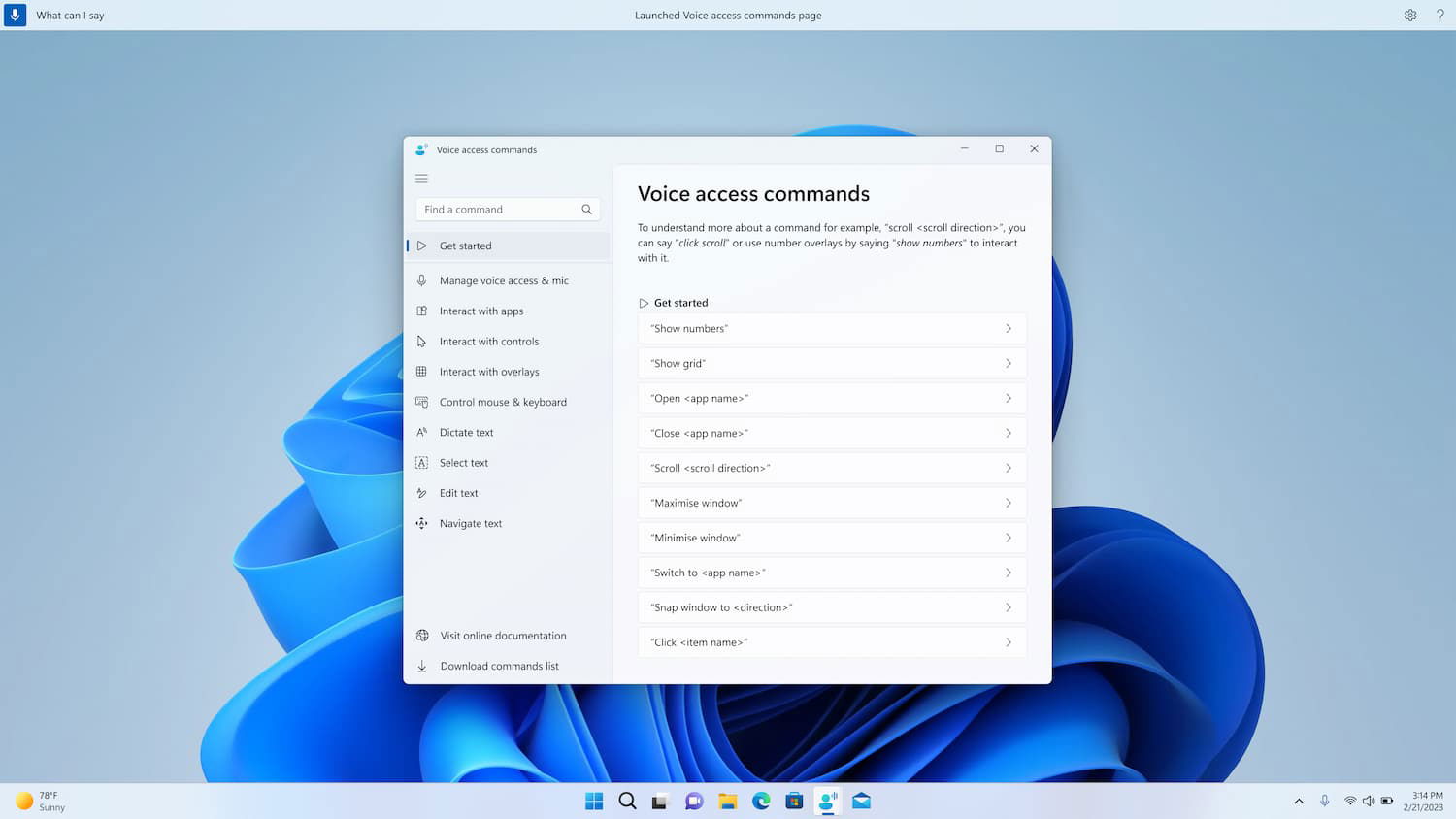 Вы можете получить доступ к странице справки по командам, выбрав «Справка» > «Просмотреть все команды» на панели голосового доступа или используя голосовую команду «what can I say» (что я могу сказать).