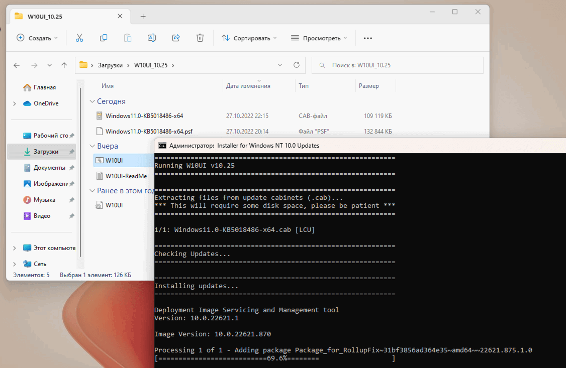- Скачайте два файла обновления KB5023011 (.CAB и .PSF) для выбранной платформы (x64 или ARM64) и поместите в папку W10UI_10.25.