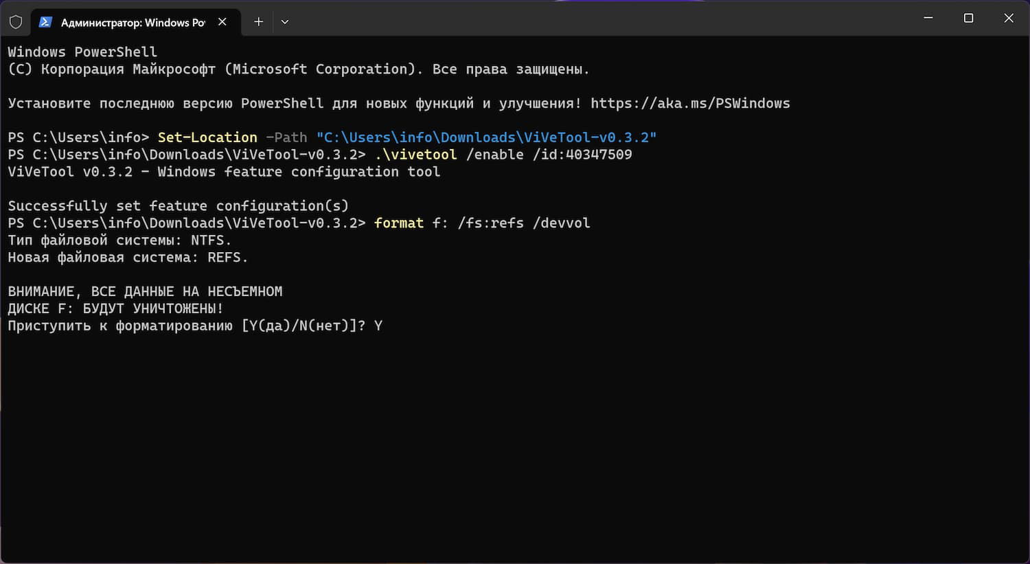 Для форматирования нужного раздела в ReFS введите в PowerShell или командной строке следующую команду. Все данные на нём будут удалены!
