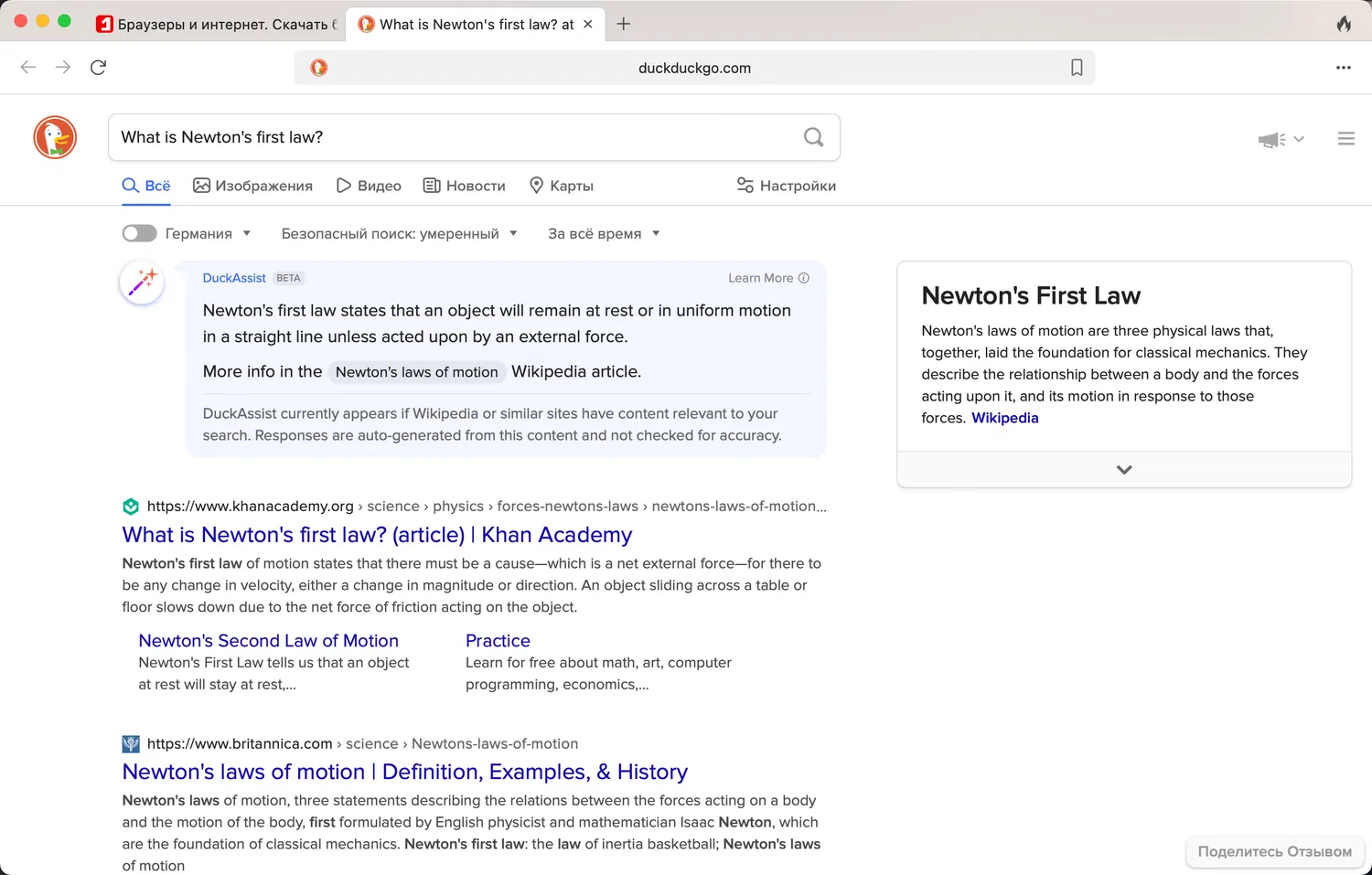 - Введите вопрос, например: What is Newton's first law?