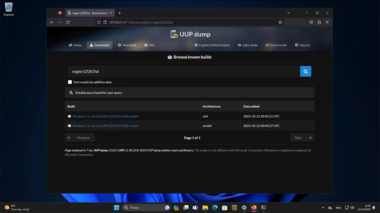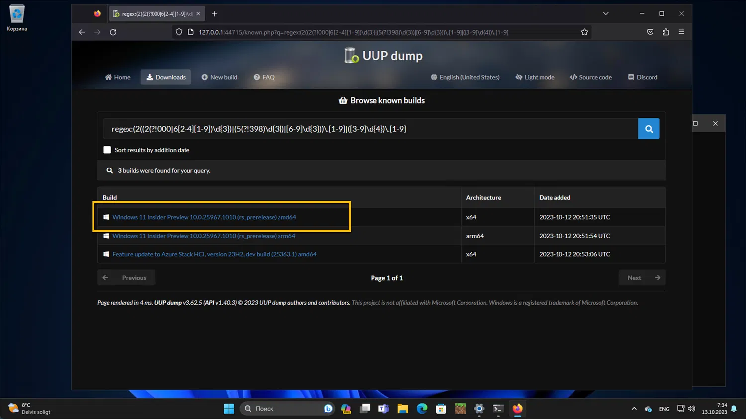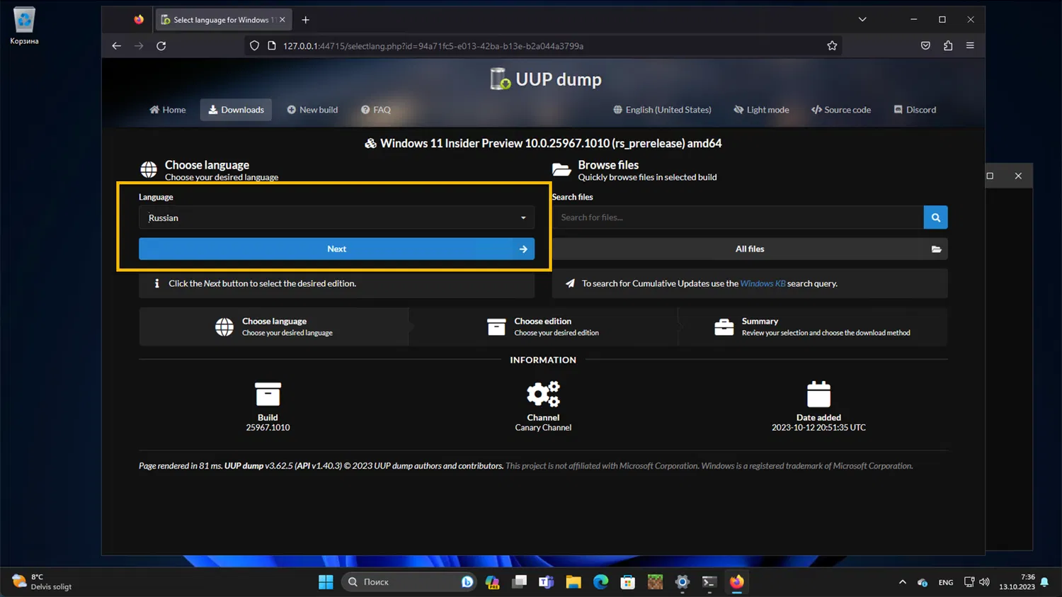 - Нажмите 1 (по желанию, вы можете воспользоваться другими опциями) и локальная версия сайта UUP dump откроется в вашем браузере по умолчанию. Используйте UUP dump как обычно.