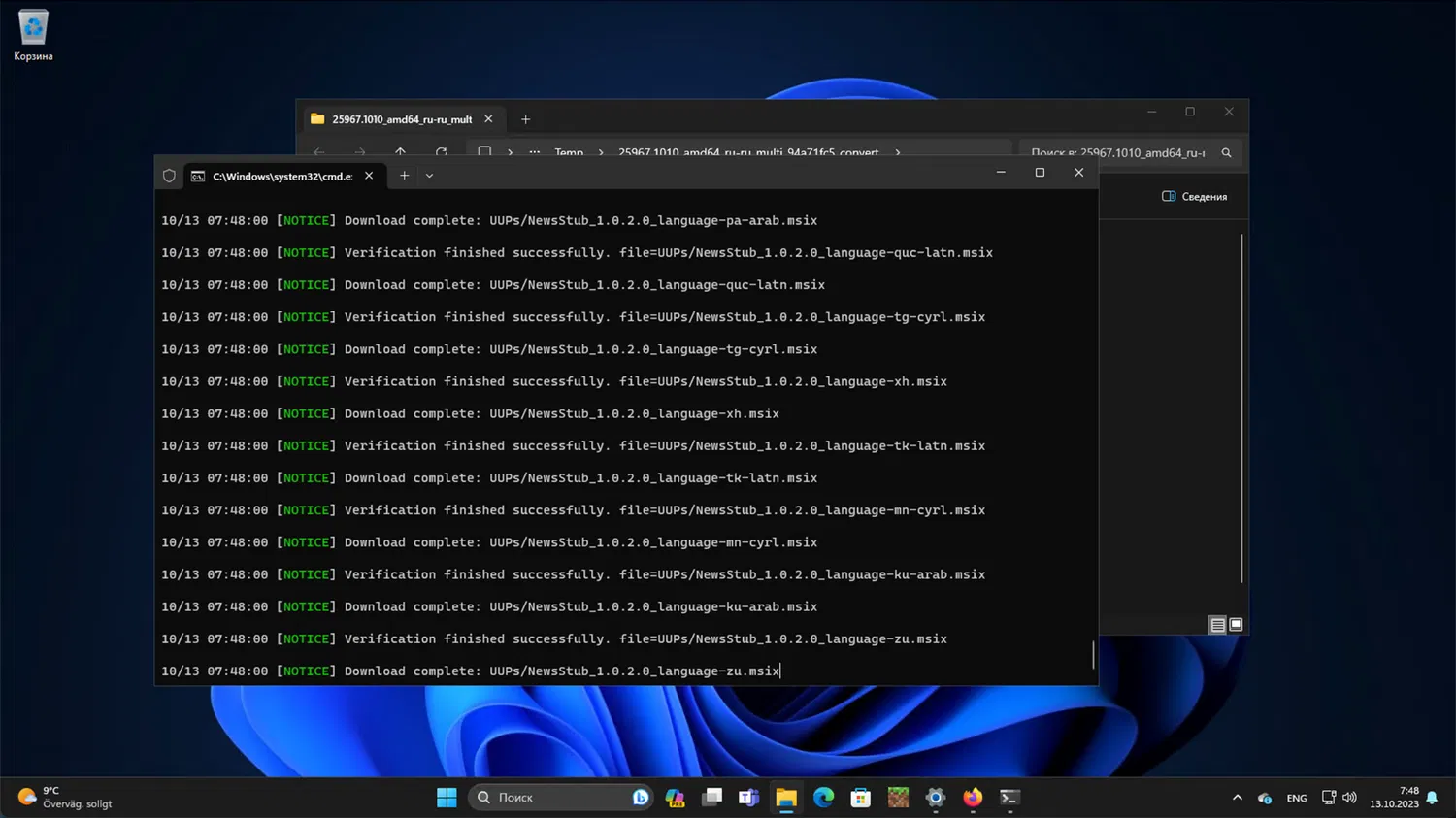 - Распакуйте zip-файл, запустите скрипт создания ISO-образа uup_download_windows.cmd от имени администратора. (uupdump-aio.cmd не закрывайте, пока не будет создан ISO-образ!)