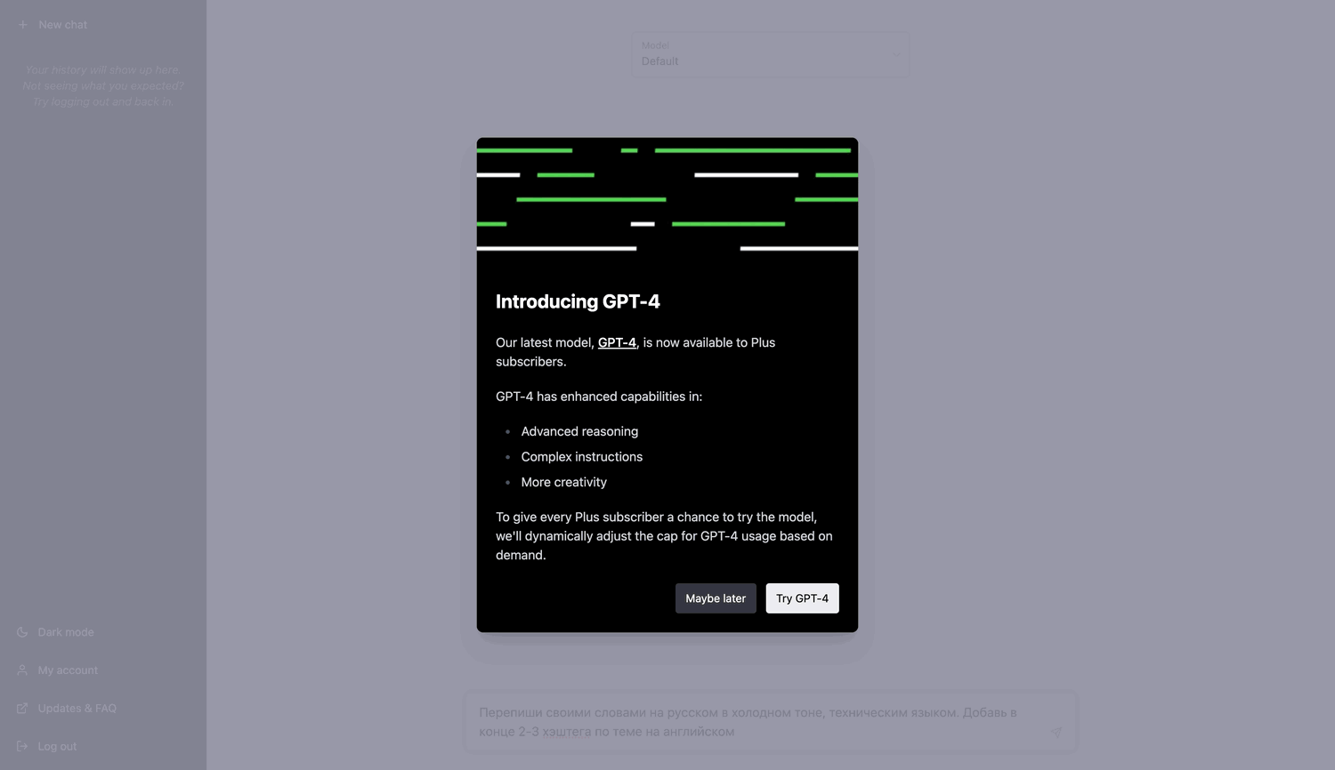 Пользователи могут записаться в список ожидания для доступа к API новой модели GPT-4, в то время как для обладателей подписки ChatGPT Plus продукт уже доступен, но с ограничением в 100 сообщений каждые 4 часа.