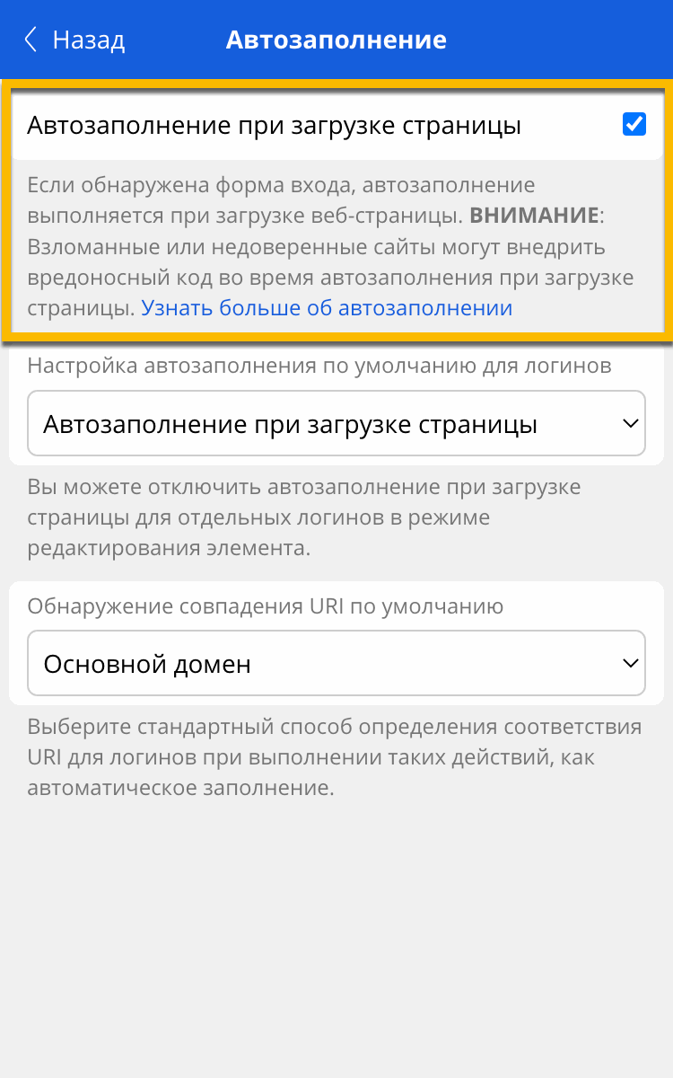 Примечательно, что Bitwarden отображает предупреждение рядом с настройкой о том, что эта функция потенциально может быть использована скомпрометированными или ненадежными веб-сайтами: