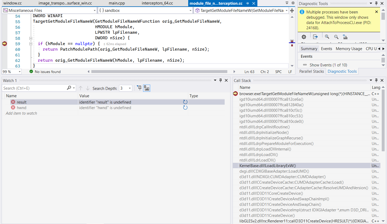 Чтобы проверить свою гипотезу, разработчики использовали особенность архитектуры Chromium. GPU-процесс работает в специальной песочнице, которая позволяет устанавливать хуки для перехватывания вызовов системных API и обрабатывать их в своем коде. Таким образом, они смогли подменить подстроку browser.exe на chrome.exe в значениях, возвращаемых функциями GetModuleFilenameA/GetModuleFilenameW и GetModuleFilenameExA/GetModuleFilenameExW.