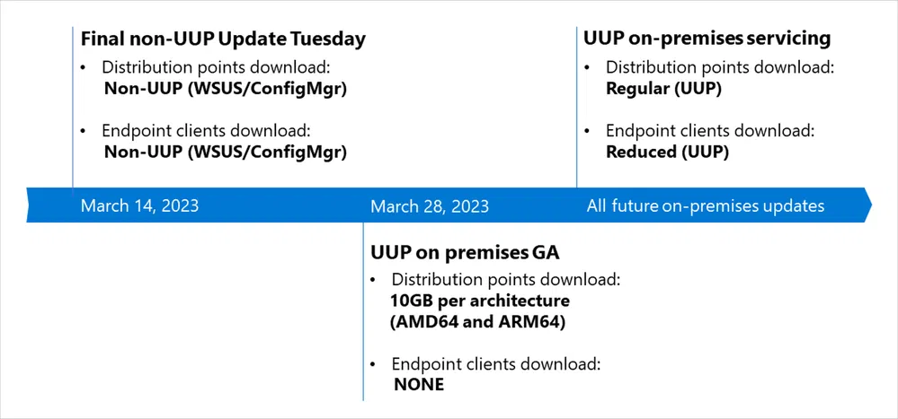 Можно сказать, что UUP — это будущее обновлений Windows 11, версия 22H2. Если WSUS или Microsoft Configuration Manager настроен на синхронизацию, то ваша организация начнет синхронизацию дополнительных 10 ГБ загрузки после 28 марта. Это всего лишь однократная загрузка для точек распространения. После этого все обновления Windows 11, версия 22H2 будут локальными обновлениями UUP, а загрузки в точки распространения будут иметь тот же размер, что и обновления до UUP.