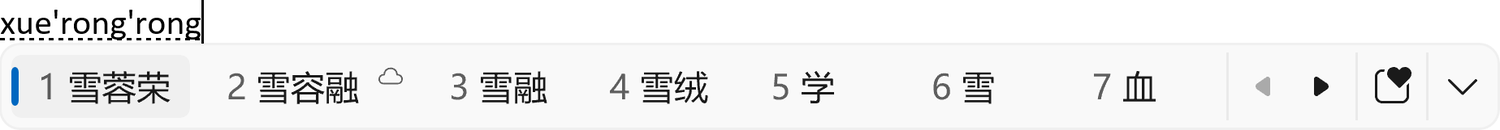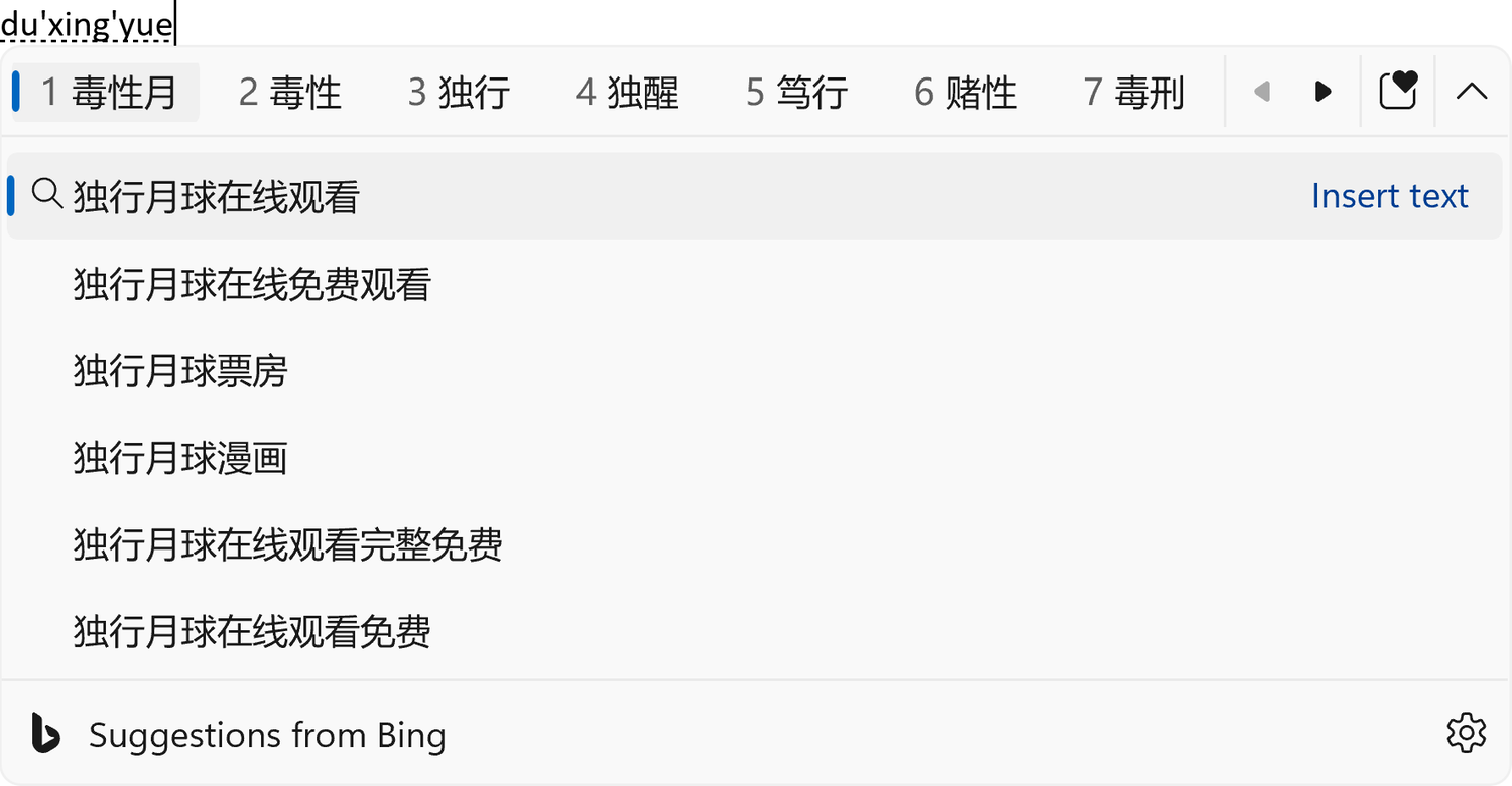 На скриншоте ниже показано, как окно предложений упрощенного китайского IME предлагает слово из Bing на втором месте.
