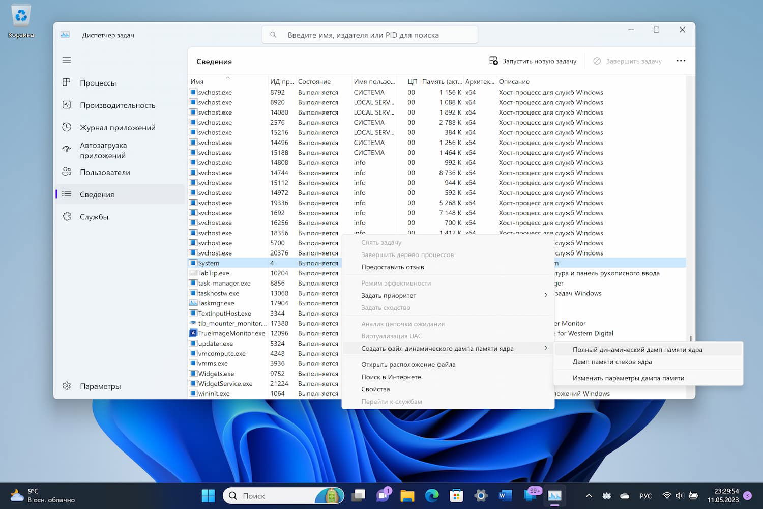 Чтобы записать динамический дамп памяти ядра (LKD), перейдите на страницу "Сведения" в Диспетчере задач, щелкните правой кнопкой мыши на процессе System, и в контекстном меню появится пункт "Создать файл динамического дампа памяти ядра", чтобы записать полный динамический дамп памяти ядра или дамп памяти стеков ядра.