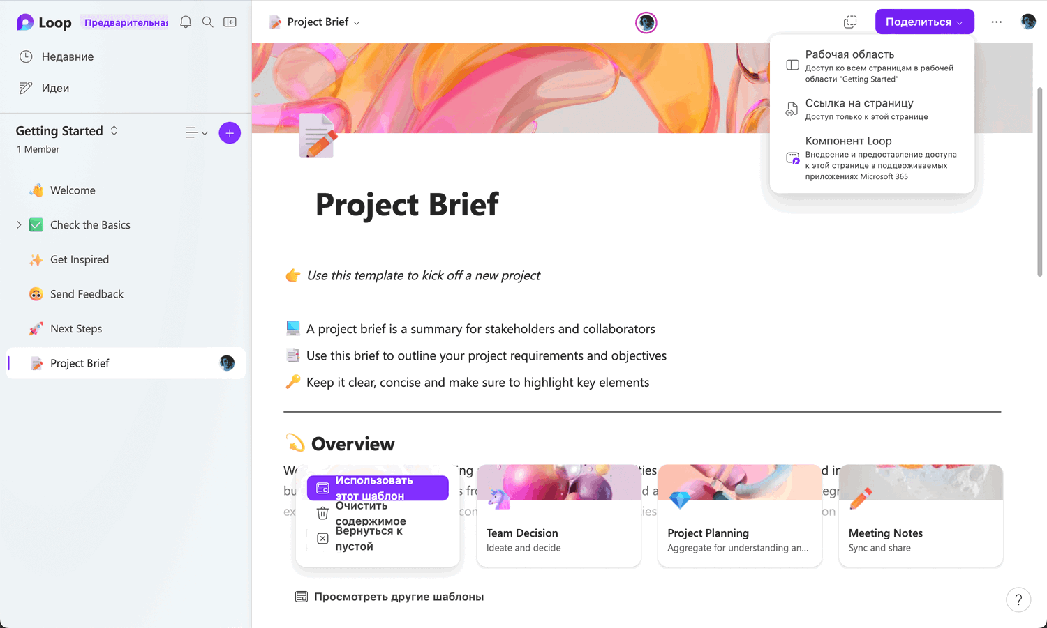 - Рабочие области и страницы: Loop предлагает настраиваемые рабочие области, где пользователи могут импортировать, упорядочивать и редактировать документы и задачи. Это облегчает совместное взаимодействие команды и ускоряет процесс работы над проектами.