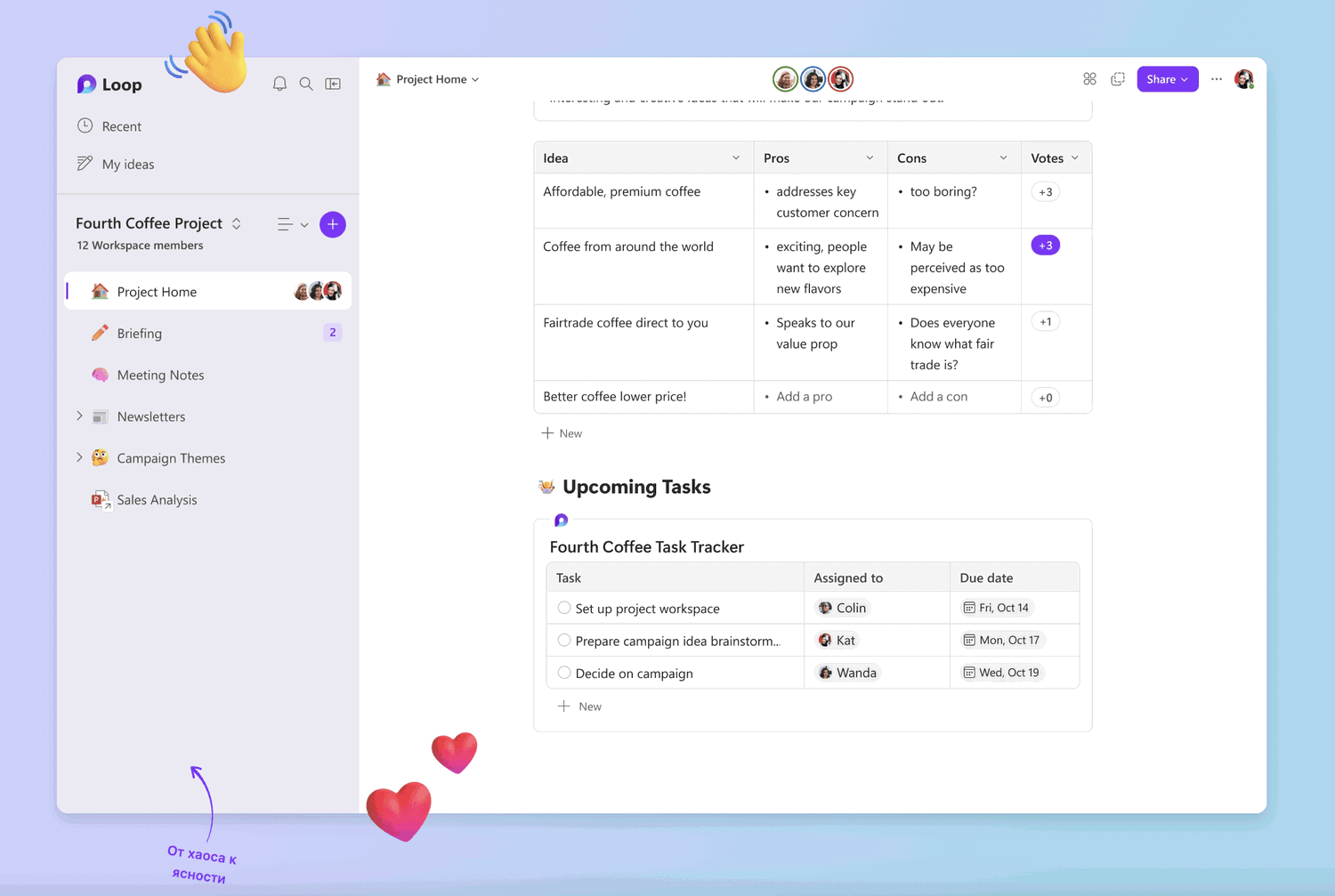 Рабочая область Loop позволяет добавлять заметки, просматривать задачи других пользователей и отслеживать прогресс выполнения. До 50 человек могут одновременно просматривать и редактировать рабочую область, но сервис оптимален для команд от двух до 12 человек.