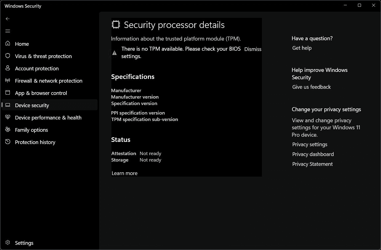 Теперь пользователи сообщают о связанной ошибке — приложение «Безопасность Windows» выводит предупреждение «отсутствует доверенный платформенный модуль» в разделе «Безопасность устройств > Обработчик безопасности > Сведения об обработчике безопасности», даже если TPM присутствует на устройстве и включен.