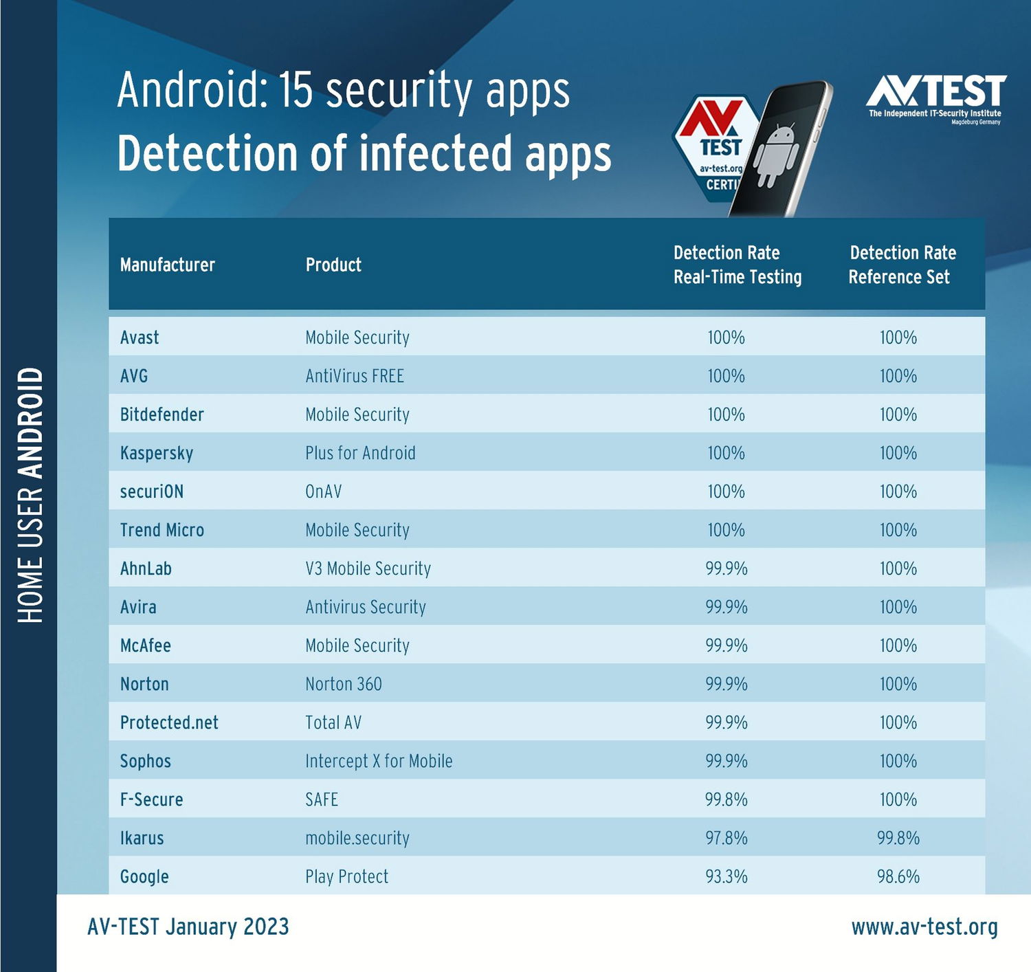 Согласно итоговой таблице тестирования AV-Test за январь 2023 года, лучшими антивирусами для Android являются: