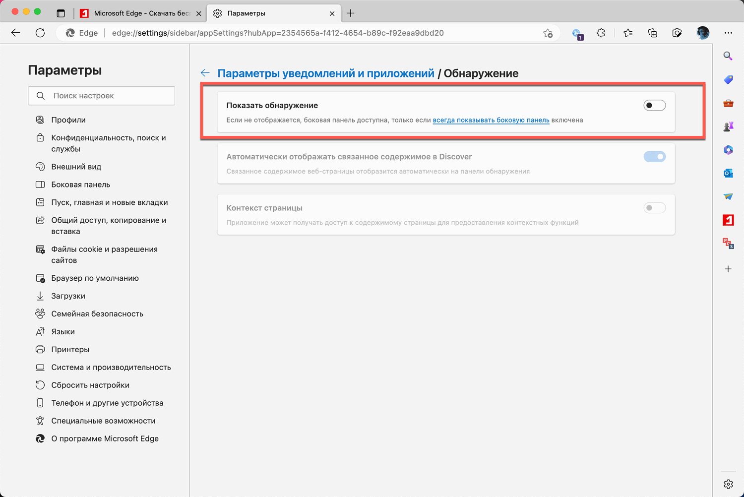 В этом выпуске администраторы получили возможность отключить приложение Discover и сохранить боковую панель. В этой ситуации колонка боковой панели будет отображаться всегда. Если пользователь хочет скрыть боковую панель от постоянного отображения, то это можно сделать в настройках боковой панели (edge://settings/sidebar).