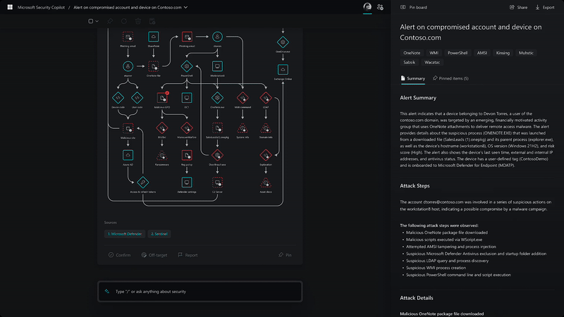 Одной из самых интересных особенностей Security Copilot является функция сценариев, представляющая собой набор действий или автоматизаций, объединенных в одну кнопку или запрос. Так, исследователи безопасности могут мгновенно выполнить реверс-инжиниринг скрипта, не дожидаясь помощи коллеги. Security Copilot даже может создать слайды PowerPoint с описанием инцидентов и векторов атак.