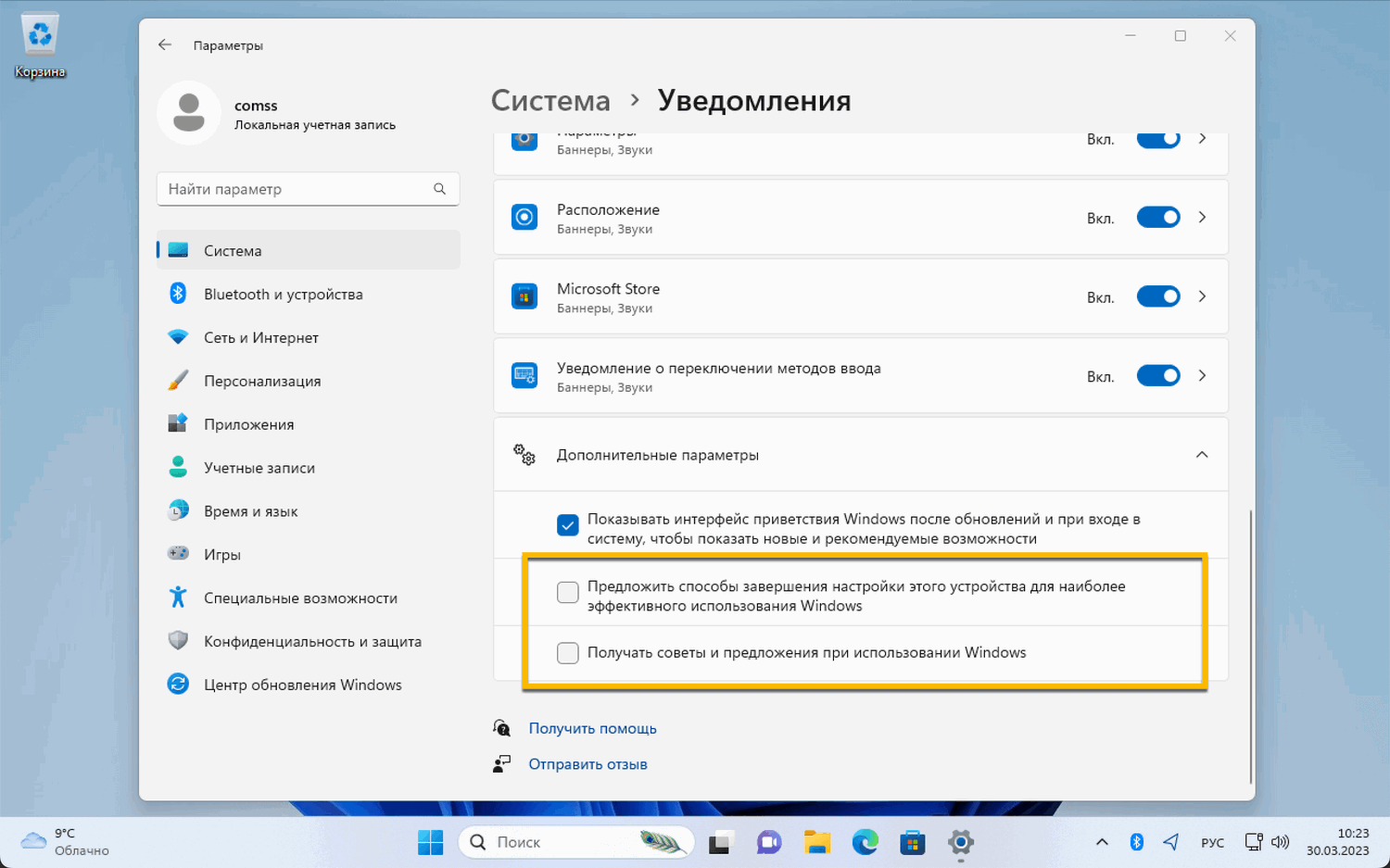 - Отключите опцию Предложить способы завершения настройки устройства для наиболее эффективного использования Windows.