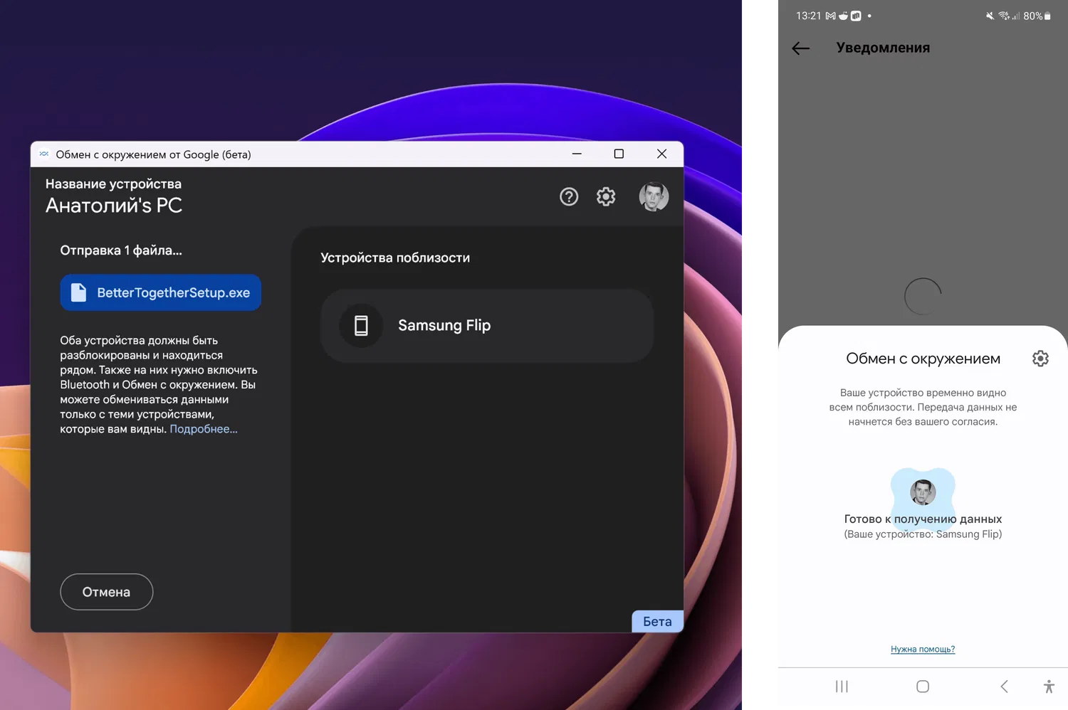 Бета-версия Nearby Share работает с вашим ПК Windows, независимо от того, открыто ли приложение на рабочем столе или работает в фоновом режиме. Поскольку мы продолжаем улучшать функциональность и продолжаем получать ваши отзывы, то будем расширять официальную поддержку для обмена контентом с другими устройствами экосистемы Google.