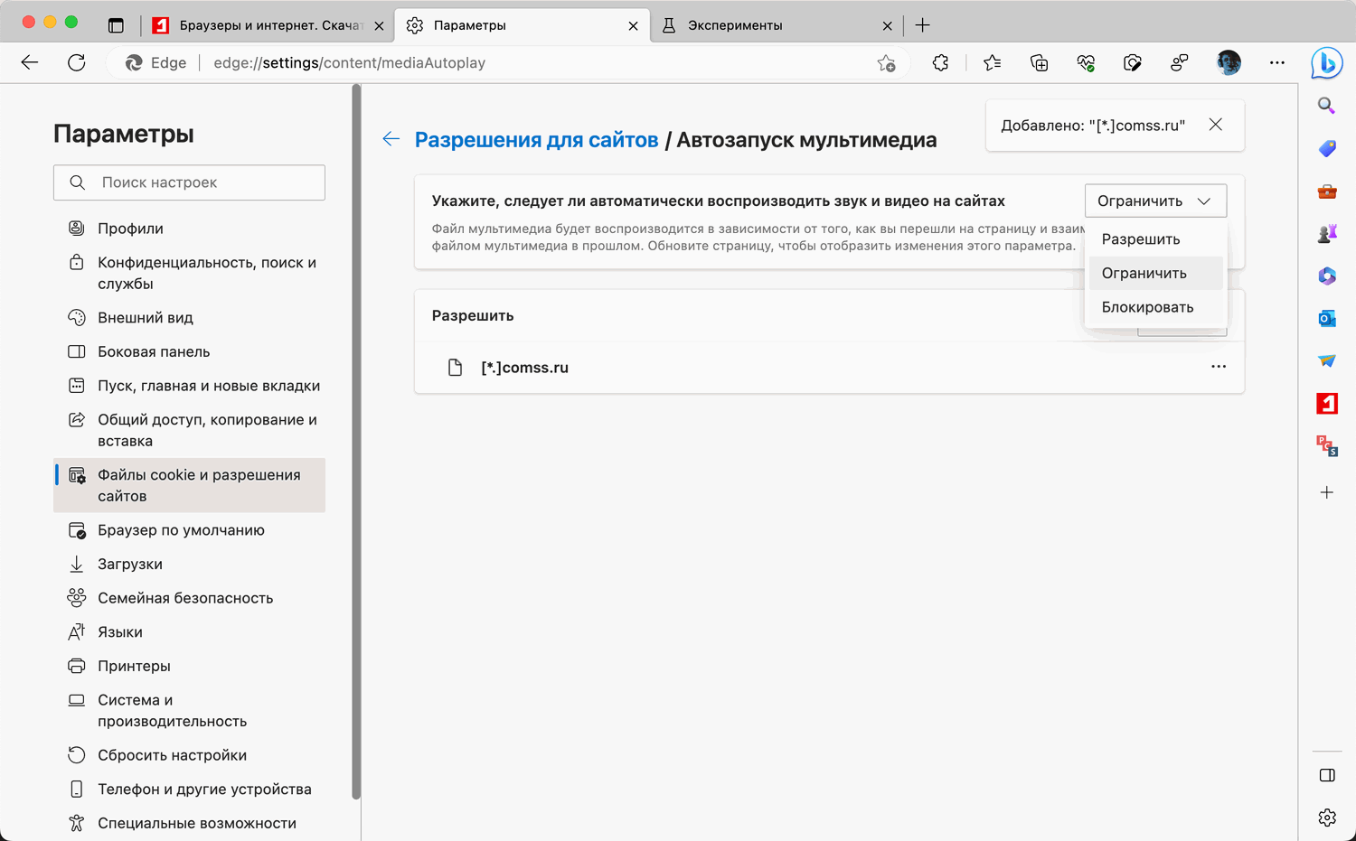 Microsoft хочет избавиться от необходимости использования экспериментальных флагов для ограничения автозапуска на всех сайтах независимо от предыдущего использования (параметр опция «Ограничить» управляет автозапуском мультимедиа, в зависимости от вашего выбора). Это небольшое изменение, но оно поможет большему количеству пользователей сделать работу в Интернете более удобной и менее раздражающей.