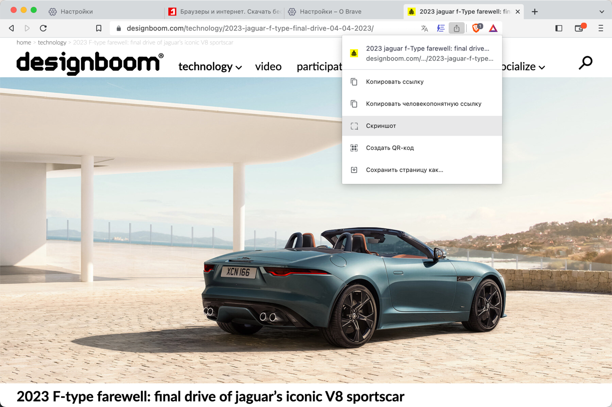 В меню Поделиться этой страницей теперь добавлена возможность сделать скриншот. Вызвать меню можно с помощью значка в адресной строке.