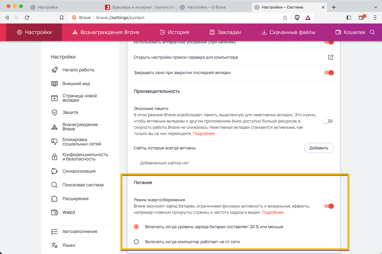В разделе настроек Система, который доступен по ссылке brave://settings/system, добавлена секция Питание. Она отображается только для портативных устройств с аккумулятором. Здесь пользователи могут управлять включением режима энергосбережения, который экономит заряд батареи, ограничивая фоновую активность и визуальные эффекты.
