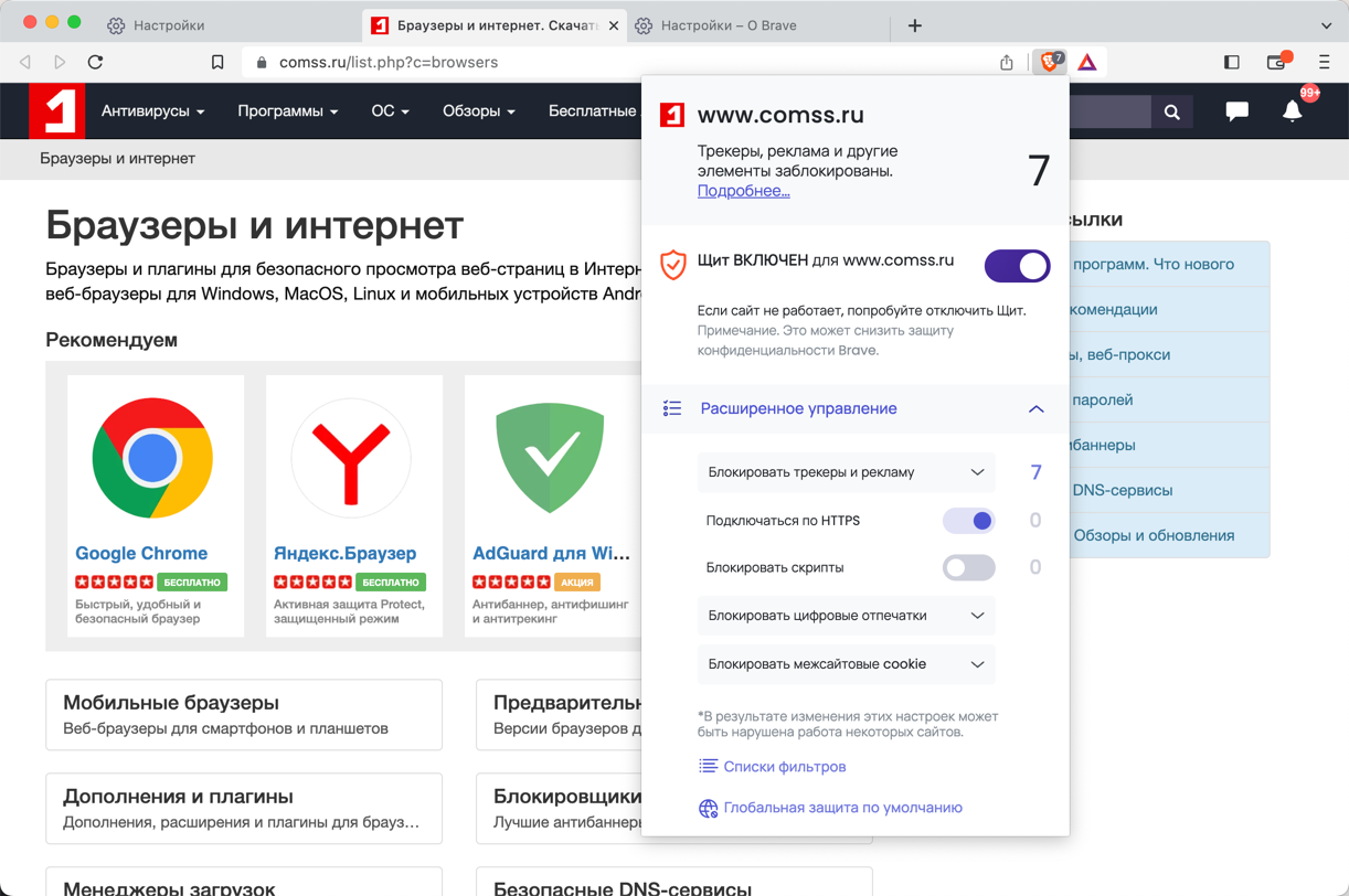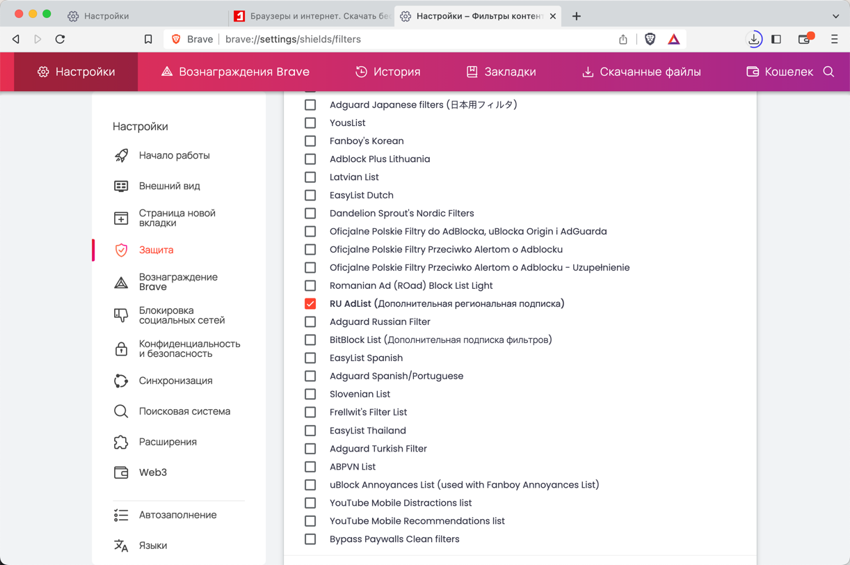 При чистой установке браузера все сценарии блокировки локального контента теперь включены по умолчанию. Их можно настроить на странице brave://settings/shields/filters.