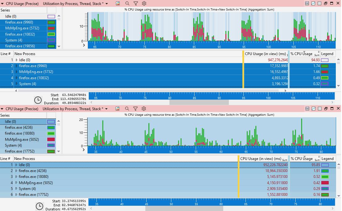 Инженеры Mozilla установили источник проблемы — службу Antimalware Service Executable, а точнее ее исполняемый файл Msmpeng.exe (Microsoft Malware Protection Engine). Они обнаружили, что исполняемый файл обращается к sechost.dll для запуска ProcessTrace, то есть обрабатывает ETW (отслеживание событий для Windows) из других процессов. По сути, он генерировал слишком много событий ETW, чем обычно, и использовал в 5 раз больше ресурсов процессора в случае с Firefox по сравнению с Chrome и другими браузерами.