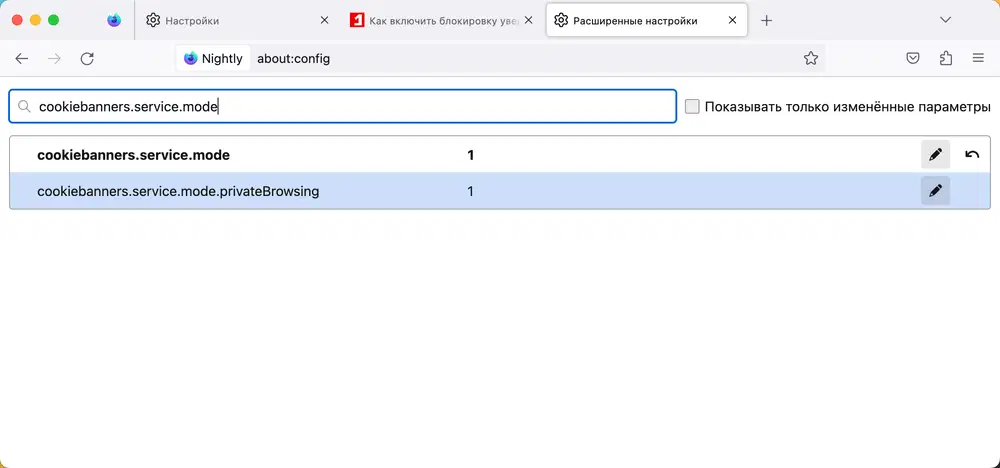 - В поиске введите cookiebanners.service.mode или cookiebanners.service.mode.privateBrowsing. Первая настройка определяет поведение баннеров с куками в обычном режиме просмотра, вторая - в режиме приватного просмотра.