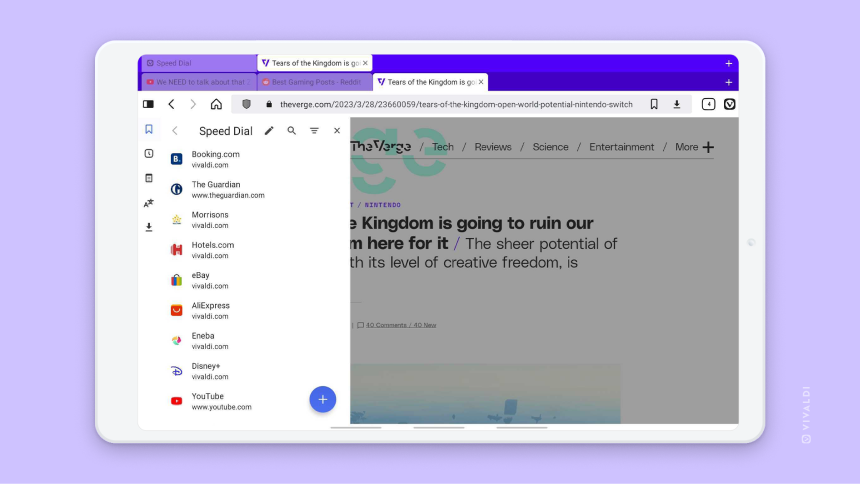 Для пользователей планшетов Vivaldi 6.0 для Android предлагает боковую панель, как в десктопной версии браузера: